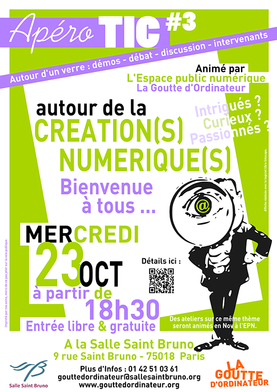 ApéroTIC sur la (les) création(s) numérique(s), mercredi 23 octobre 2013, 18h30, Salle Saint Bruno. Pour s’informer, échanger, débattre, sur le rôle et l’influence des technologies de l’information et de la communication dans la vie quotidienne.