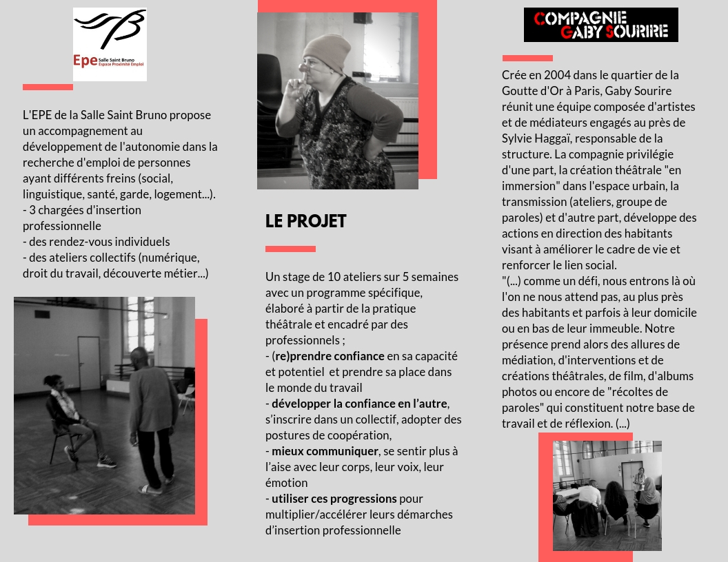 L’Espace de Proximité Emploi de la Salle Saint Bruno propose, en partenariat avec la compagnie Gaby Sourire, une nouvelle action collective de remobilisation professionnelle en s’appuyant sur les techniques du théâtre.