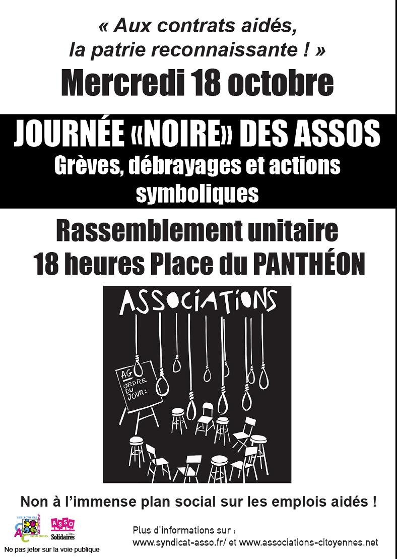 La Salle Saint Bruno s’associe au mouvement de mobilisation des associations, initié par le Collectif des Associations Citoyennes et le syndicat ASSO, contre la diminution drastique et brutale des contrats aidés et appelle au rassemblement Mercredi 18 Octobre à 18h Place du Panthéon.